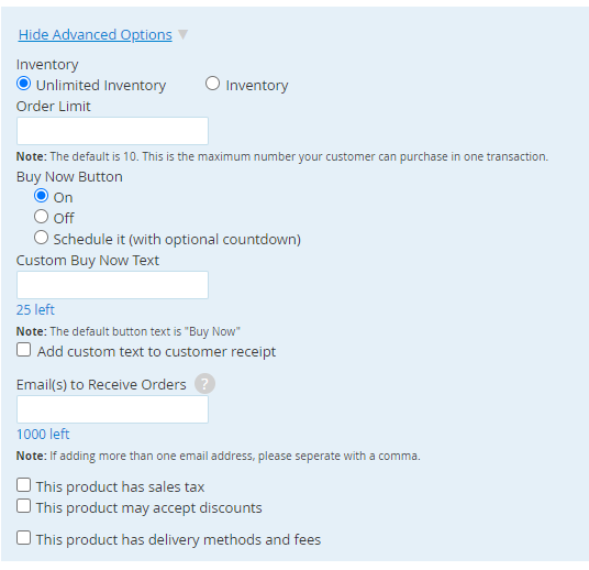 This will be the total quantity of this product a customer can add to their cart in a single transactionChoose whether the Buy Now Button is On (recommended), Off, or Scheduled
