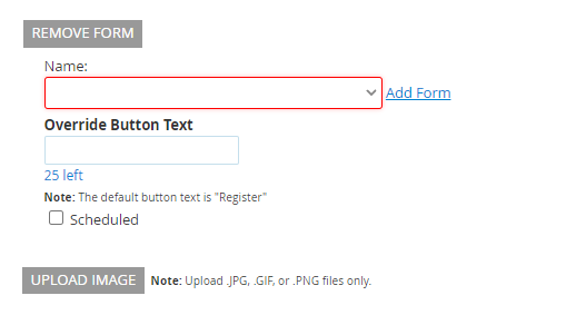 If your commerce product should be paired with a Form for completion prior to completing the transaction, click Add Form- Select the appropriate form the drop-down or a Add Form- Use the Override Button Text field if you would like to change the default button text