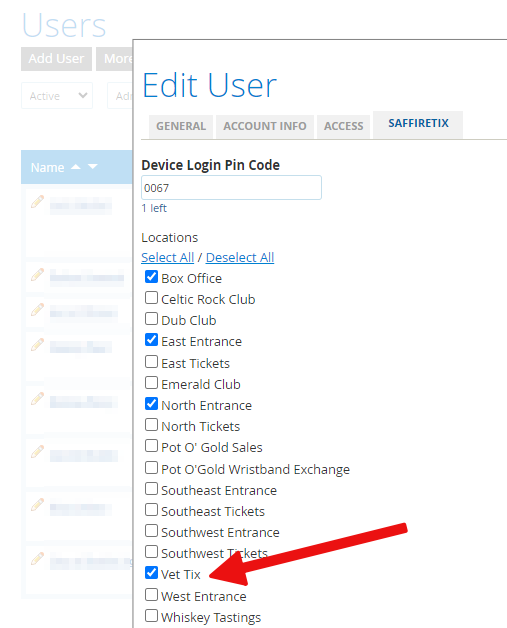 Add the Vet Tix location to the appropriate Admin Users (on the SaffireTix tab):