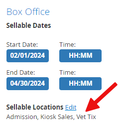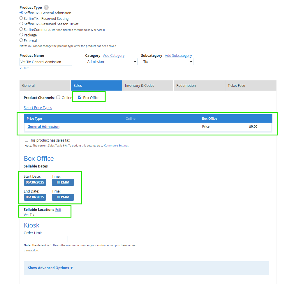 On the Sales tab, add the Box Office channel and enable the Vet Tix sales location.