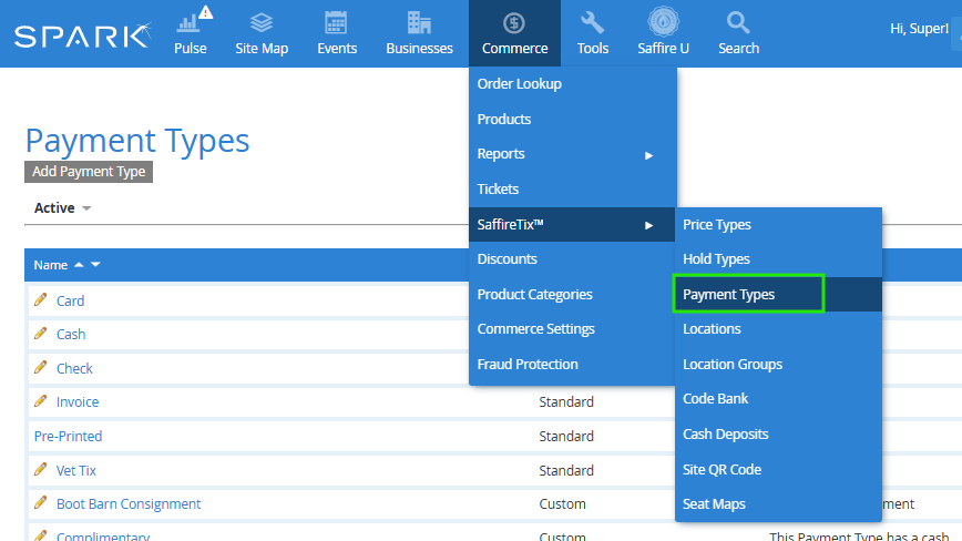 To add a payment type, navigate to Commerce > SaffireTix > Payment Types: