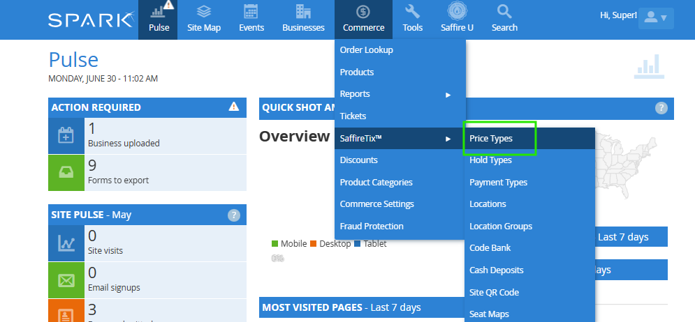 To set up a custom Price Type, navigate to Commerce > SaffireTix > Price Types