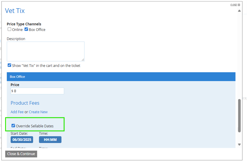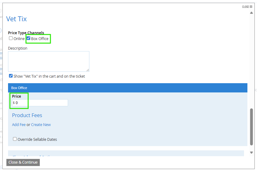 Set the Vet Tix price type on the product to sellable through Box Office and assign a price. You can set the price for a normal ticket price, or for $0, depending on how you would like your reporting to show your donation. If you are using a $0 price, follow the instructions above for creating a custom $0 payment type.