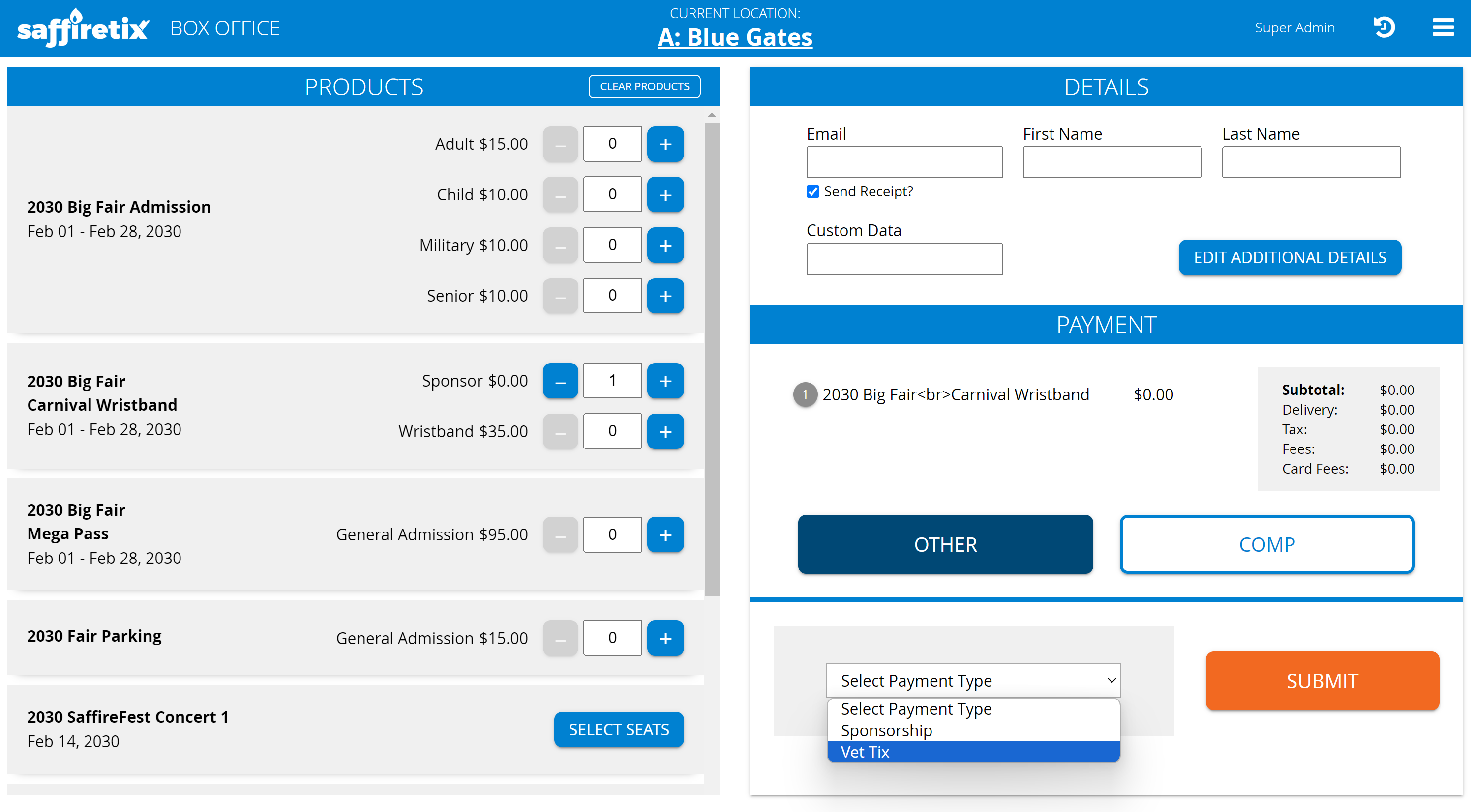 In Box Office, you will be able to create your full order and then select which custom payment type is to be used using the Other button and dropdown before clicking SUMBIT to complete the order.