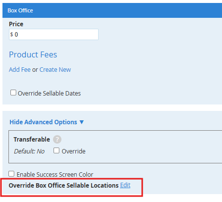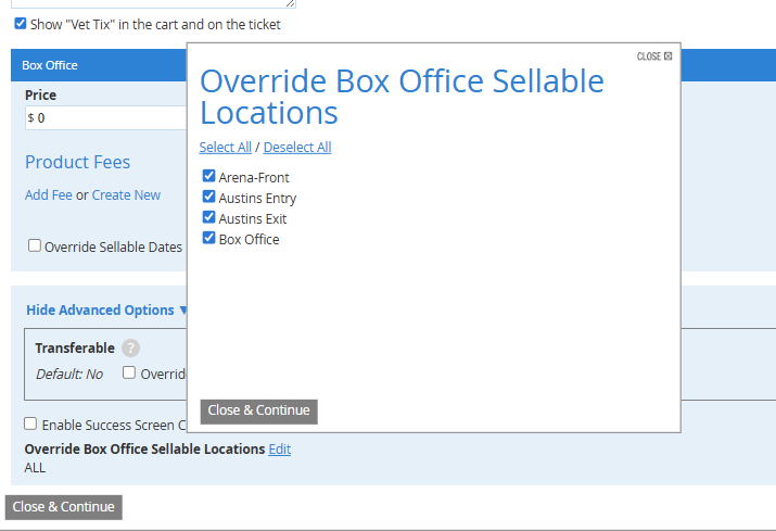 While still in the above Price Type settings window, scroll down and open Advanced Options. Select Override Box Office Sellable Locations. To prevent Vet Tix tickets being available for sale at any other locations, select all of the locations in the window that comes up.