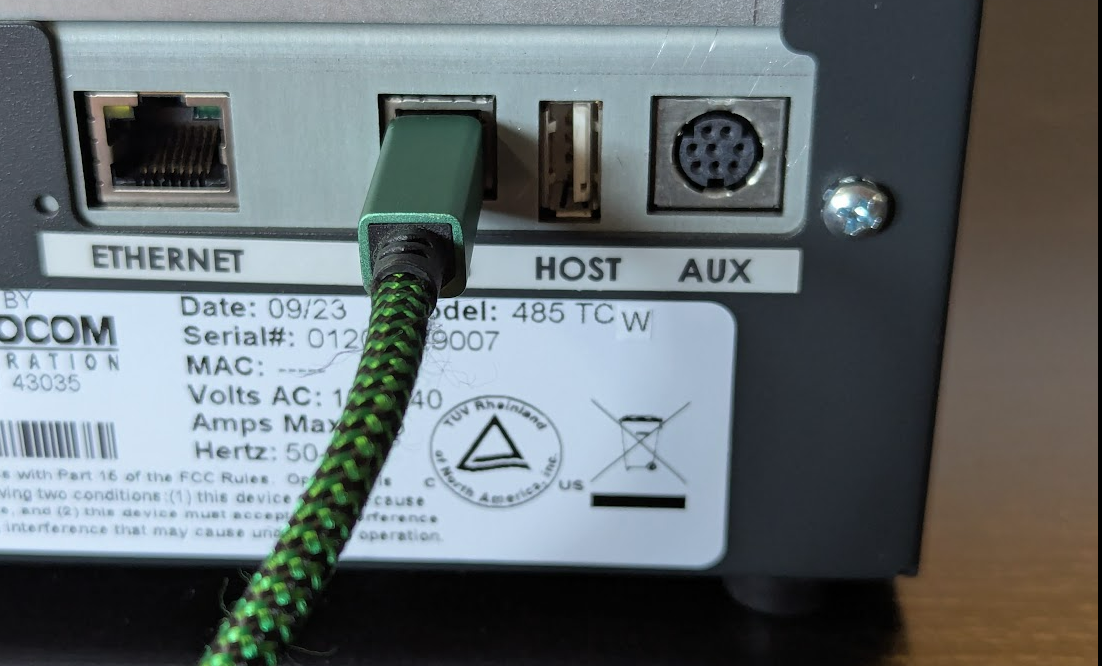 Make sure the USB hub is plugged into the port on your laptop or PC that is marked as the USB hub port as well. If you are setting up a SaffireTix kiosk with this printer, use the green cable coming out of the kiosk hub to connect your printer.