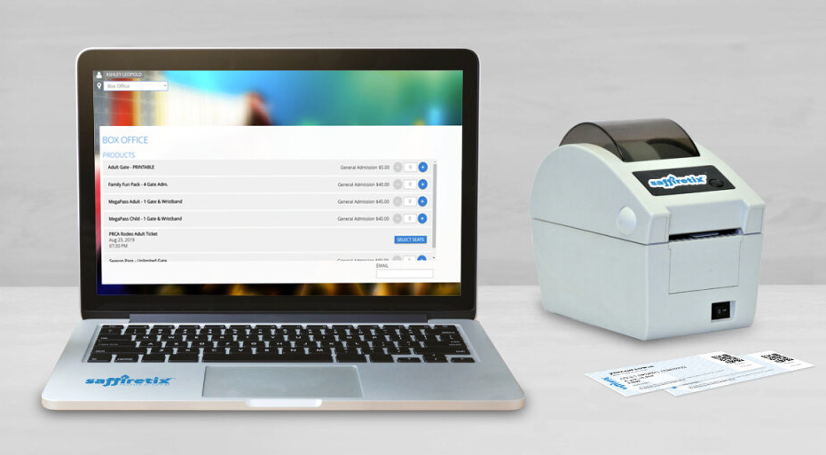 Box office equipment is used for selling tickets in a traditional gate, box office, or ticket window setting. These setups require a desk or table to set up a laptop and printer, an internet connection, and a power source for the devices. Sales made at a box office utilize SaffireTix Box Office interface, which can be accessed via www.yoururl/boxoffice.