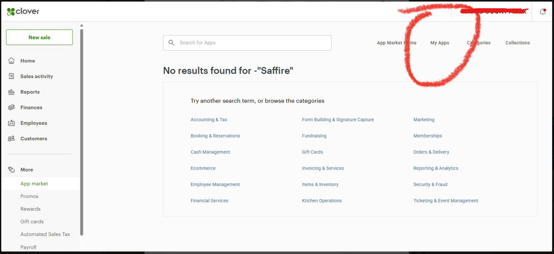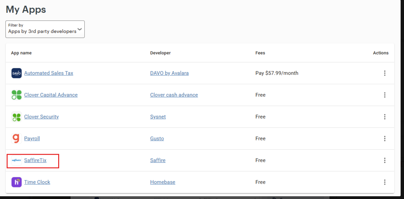 The SaffireTix App will automatically install on your Clover device after you have enabled it on your Clover Portal. If the App is not installed, visit your Clover Portal, select My Apps and look for the SaffireTix App.