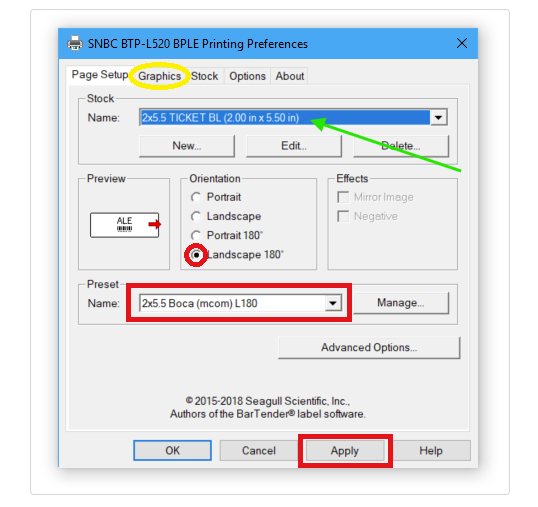 If you do not see the option in this drop-down menu for the 2X5.5 Boca L180 preset, you may need to download and add our configuration file to your printer settings. See details on the Microcom 520 Driver Installation page.