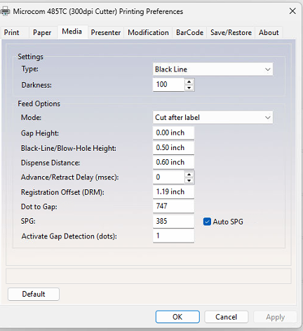 Is the dispense distance set correctly? Update the dispense distance on the printer settings. In Windows settings, select Printers, open the correct printer, and select Printer Preferences. On the Media tab, you can experiment with the setting between 0.50" and 0.60" to see if this resolves the feed issue.