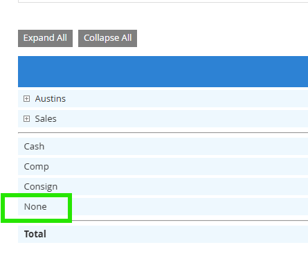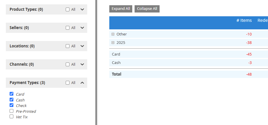 Let’s say someone originally purchased a ticket for a Saturday event but decides they would rather come on Sunday. We edit the order to make that exchange by removing the Saturday ticket from the order and adding the Sunday ticket. In the sales report, you’ll see a credit for the ticket that was removed (returned), but it will be assigned to the 'None' payment type. This means no actual refund occurred — the system is just logging that credit as part of the product exchange.