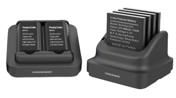 External battery charging stations can be ordered for mobile Scanning/Selling devices and their associated triggers. Each charging station charges 2 trigger batteries or 4 scanner batteries. Unless specified charger capacity sent will be determined based on the number of devices being shipped.