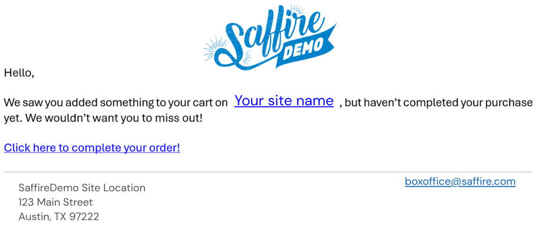 We have overhauled the look and feel for this feature. While we previously had a way for you to send out a cart abandonment email automatically through spark to encourage your customer to complete their transaction, the old email didn't have a custom look or feel to it. It was simply text stating that you haven't completed your purchase and a hyperlink to finish that process. This ENHANCEMENT now has a branded look and feel to it that encourages your customer to interact.