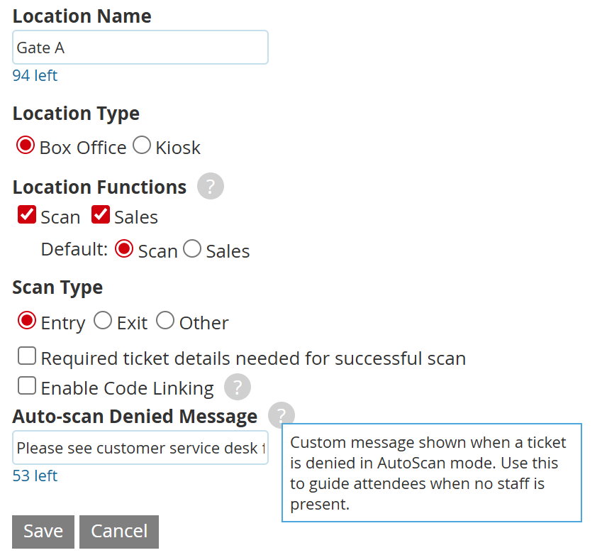 This custom message per location can be configured in Spark. Go to Commerce > SaffireTix > Locations, edit a location and then you will edit the Auto-Scan Denied Message