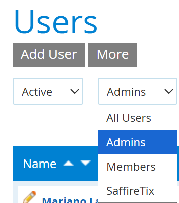 The Users page now loads with the filter preset to Admins. Landing on these accounts on first load and requiring a dropdown switch to view Customers or SaffireTix Users, we hope to eliminate the common “Why do all these people have access?” confusion.
