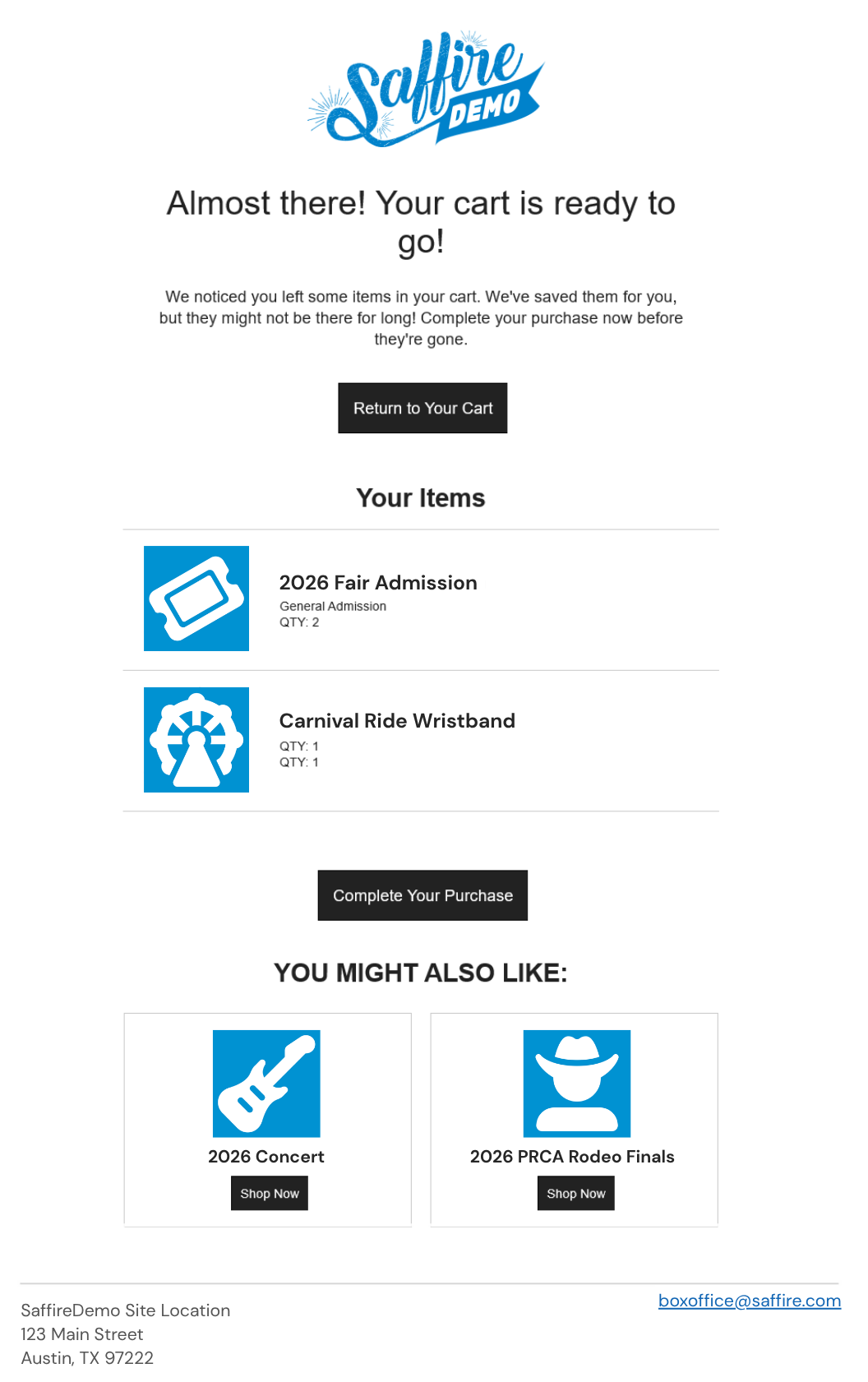 The email which goes out has a branded look and feel to it that encourages your customers to interact. It also has the option of including a 'You may also like' section to promote product upsells. Just let Saffire Support know if that should be enabled.