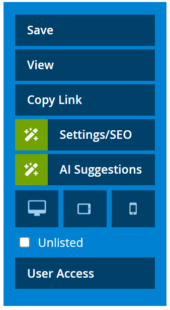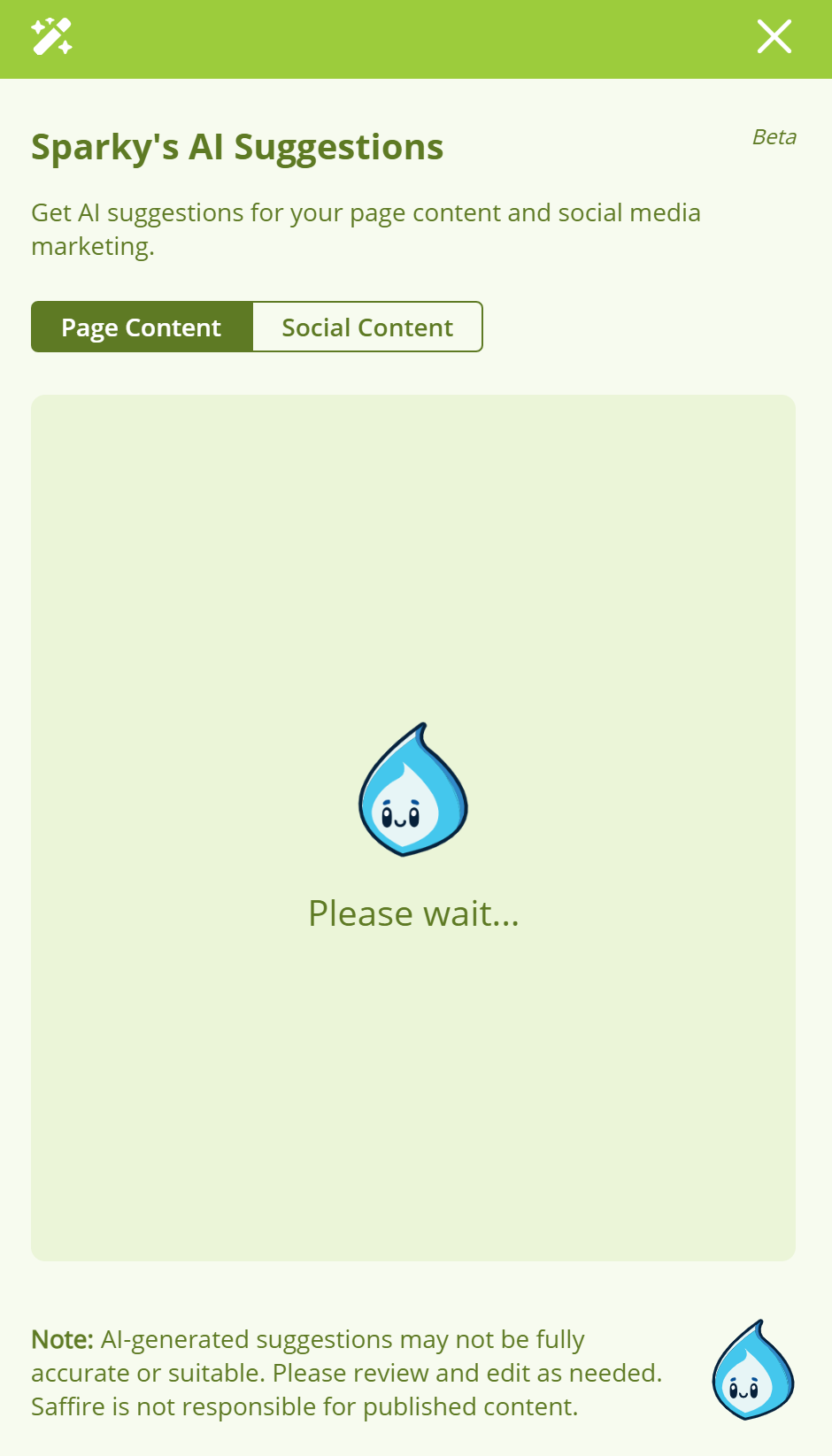 From the same Tools pop out on the right side of your page editor, you'll see the new 'AI Suggestions' button. This will open up an new panel on the page. Sparky will automatically review your page content to make some suggestions for page content and social media marketing material.