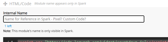 In addition to the code input field, you can also provide an internal name for the module. This name will appear on the Spark page editor but will never be shared with your customers using the website. This internal name allows you to identify what is included in the module for quick reference.
