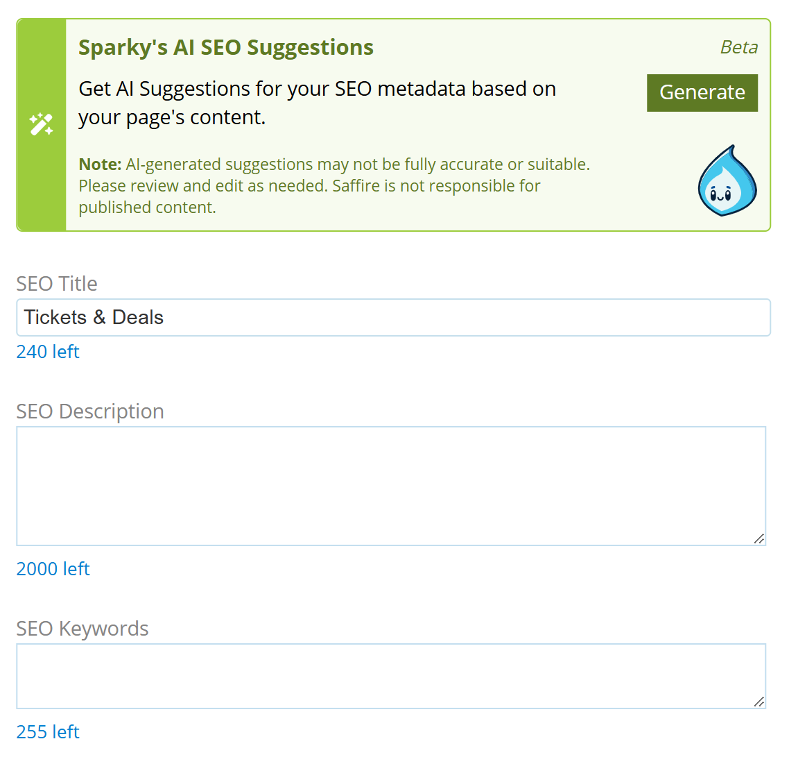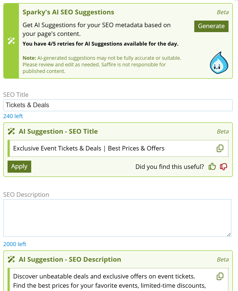 If you get a result from Sparky that is completely wrong or you just want to Retry on the page for new results, you have the option to 'Generate' from the SEO Settings popup or 'Retry' from the AI Suggestions panel.