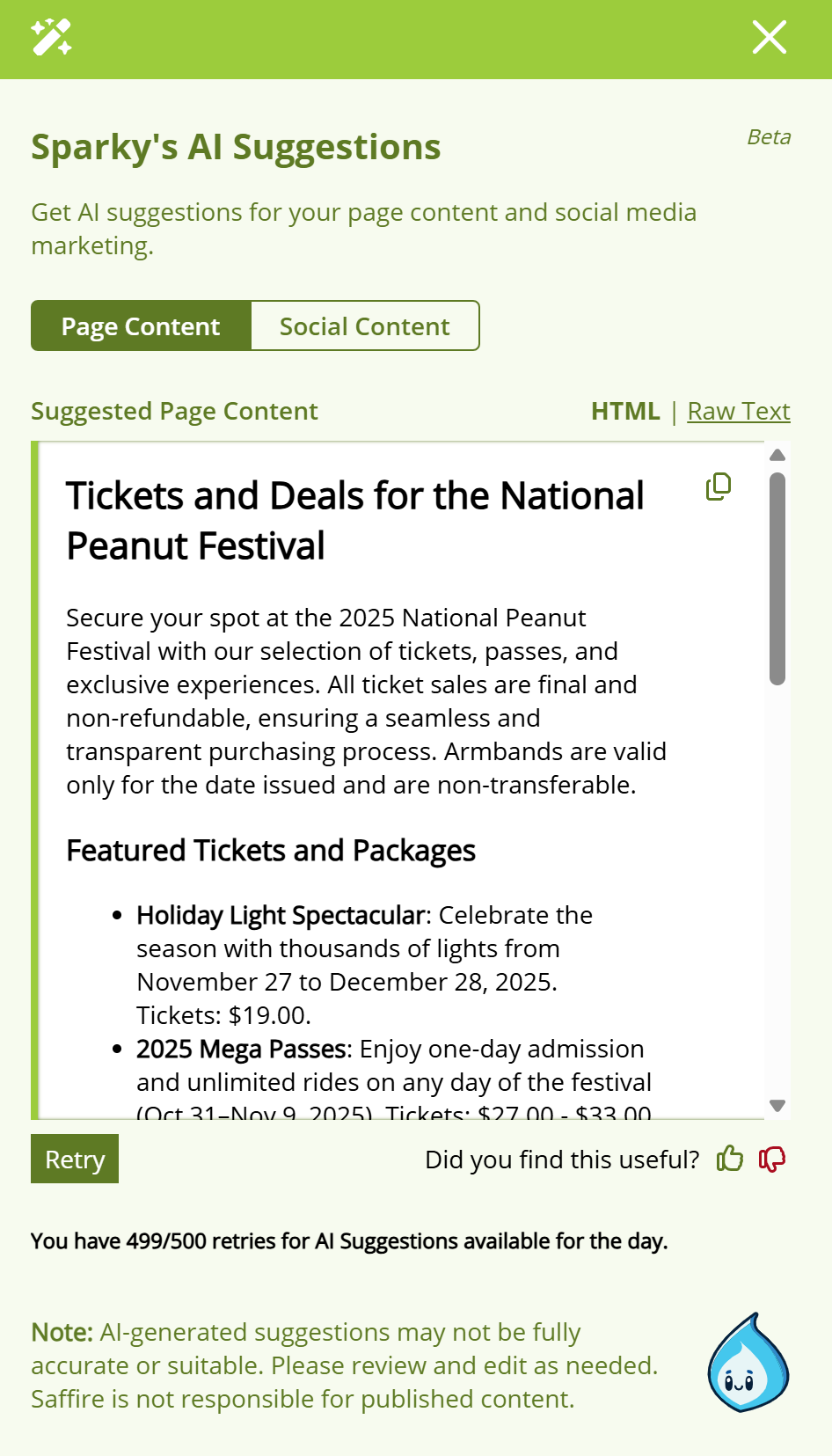 We strongly encourage you review and/or edit any AI-generated content as needed before publishing it to your page. If you have Sparky generate content from a blank page, he'll do his best job to understand your goal, however if he's not providing correct or relevant content, you can help him along by including a Text/Gallery Module on the page with a short description of the event and bullets you think are noteworthy for Sparky to include in his content.