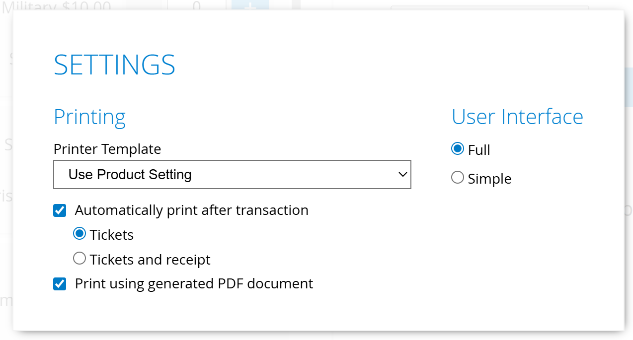NOTE: Keep in mind that if you are using the product setting for templates, make certain that all of the products you are selling are using the same 'size' ticket. You cannot have one ticket printing to Ticket: Standard Box Office/Kiosk (2x5.5) and another product printing to Ticket: Standard Full Page (8.5x11) - this will result in printing errors.