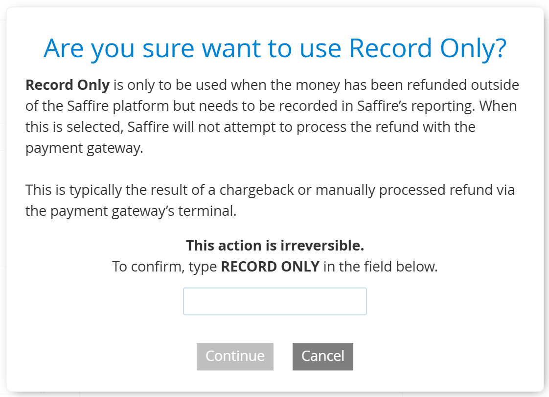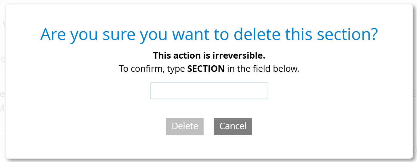 A few steps in Spark are irreversible, so before moving ahead with deleting a section or module, or using the Record Only option, the platform now requires more than just a simple click of a button. These now require users to type in specific text in order to complete the operation. You'll see popups like these: