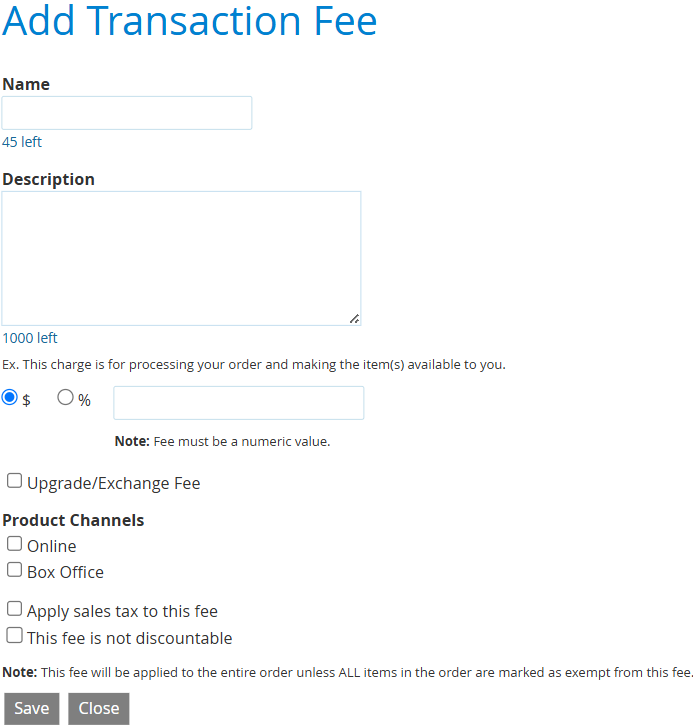 Transaction Fees are applied one time at checkout. They are commonly used for credit card processing fees predetermined by your payment gateway. When the transaction fee is set as a percent, the percent is calculated on the product total before fees. When the transaction fee is set as a dollar amount, the amount is calculated on the product total including fees.