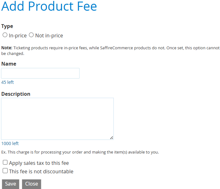 1. Choose if you would like to Include in Price. This increases the total product cost by the fee amount rather than showing the fee as a separate line item during checkout. The fee will be broken out in your Sales Report. See the All-In-Pricing section below for important details!