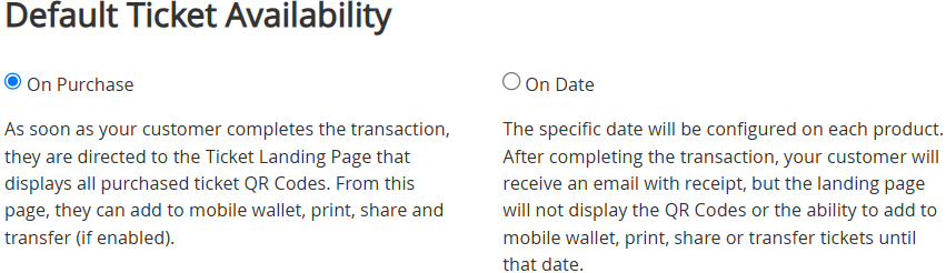 Controls when customers can access their tickets after purchase. The “On purchase” option makes tickets instantly available on the Ticket Landing Page, allowing customers to print, share, transfer, or add them to a mobile wallet. The “On date” option delays access until a set date, hiding QR codes and ticket actions until then.