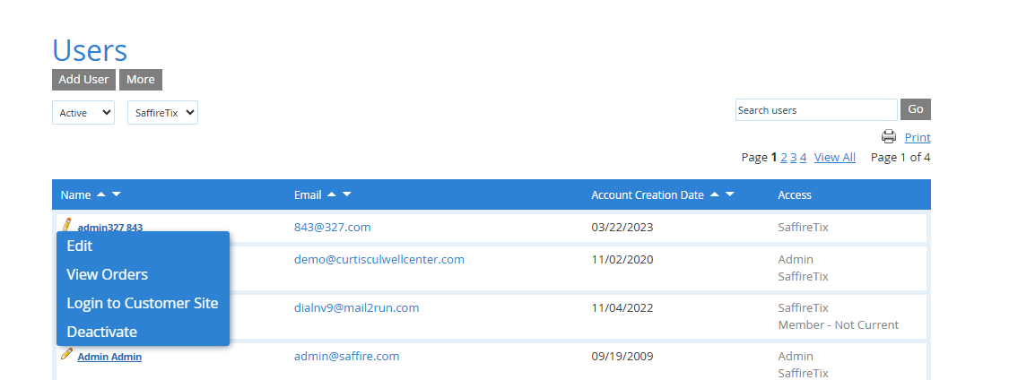 If you need to remove Spark or SaffireTix access from a user, you can do this by Deactivating the user. Hover over the User name and select Deactivate.