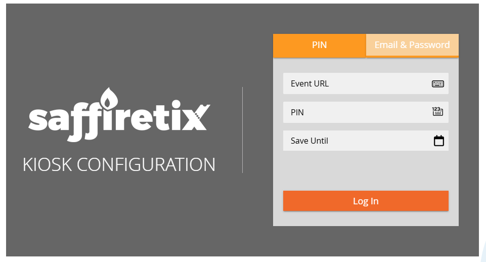 You can use your SaffireTix PIN or email and password to log in. Enter the end date of your event. After the date selected has passed, the kiosk URL will be forgotten. This is perfect if you have multiple URL's you utilize the kiosk for!