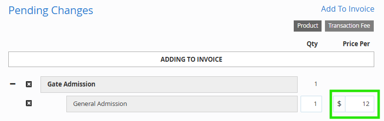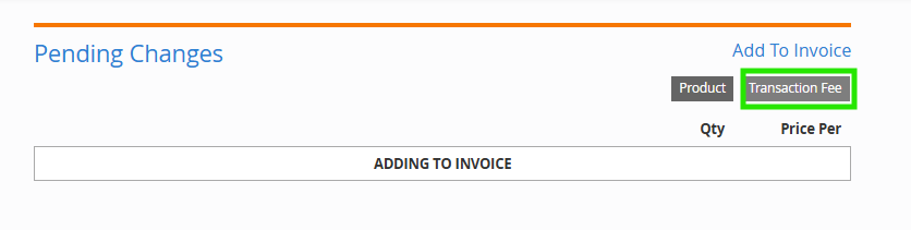 You can also add fees to current invoices through the Order Management tool by clicking the Transaction Fee button in the Add to Invoice area under Pending Changes.