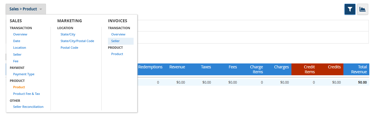 In the Sales Report, there is a section in the Views selector for Invoices. You can select Overview, Seller, or Product.
