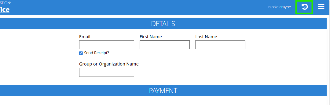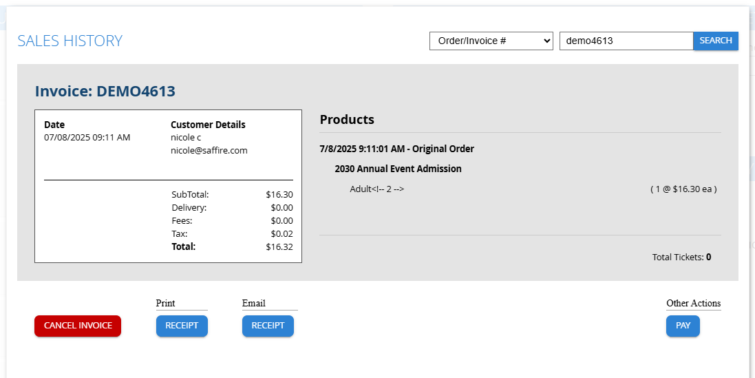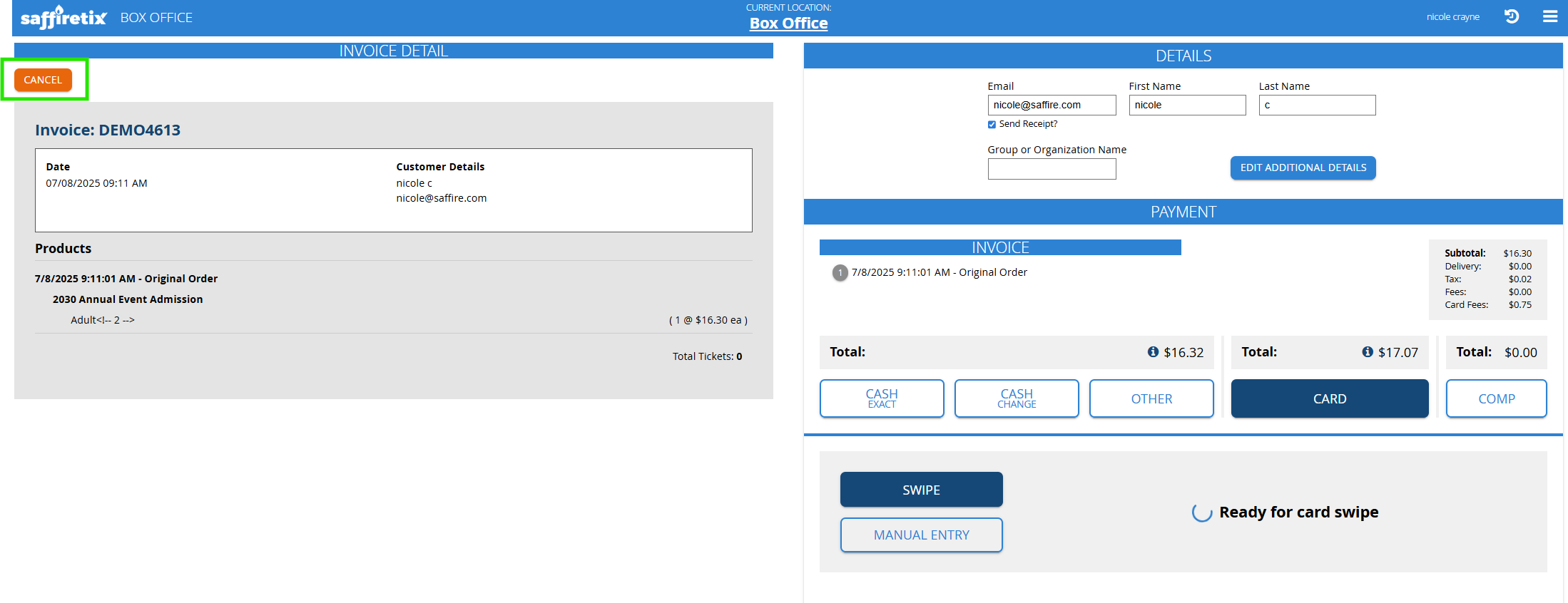 Invoices can be paid or cancelled in the Box Office interface as well. To find an invoice, select the Sales History icon in the top right, and enter the Invoice ID #.