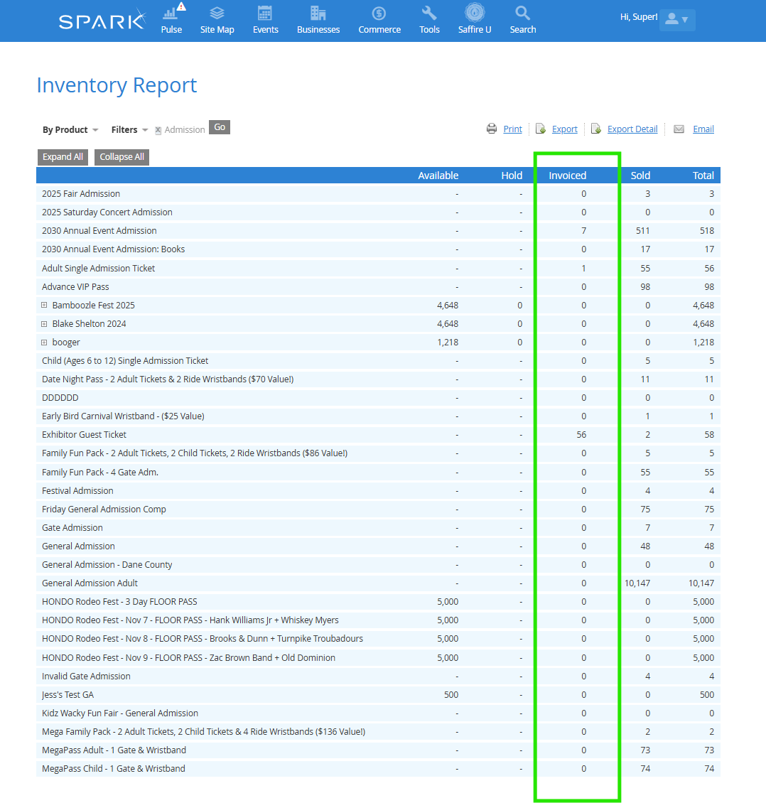 Admins can view how much inventory is tied to invoices by viewing the Inventory Report and selecting a category. Note that the total under Invoiced only includes current (unpaid) invoices; once an invoice is paid, it is converted into an order and will be added to the total in the Sold column.