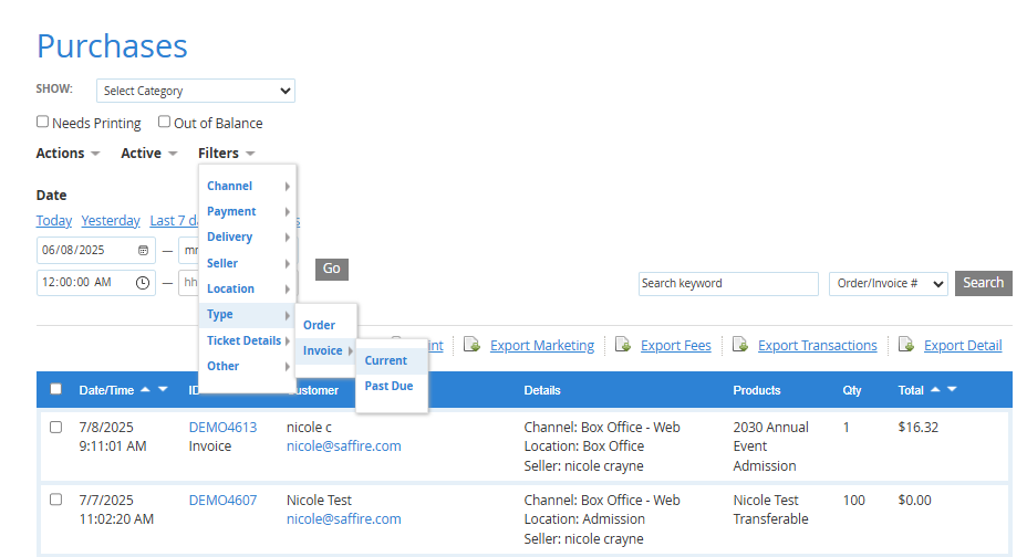Invoices can be viewed in the Purchases Report by navigating to Commerce > Reporting > Purchases. To see only invoices, filter by Type > Invoices; this will show both Current and Past Due invoices together. To filter further, select Current or Past Due. Note that there is no option to filter for Paid invoices. This is because paid invoices are converted into completed orders, and will need to be found by filtering by Type > Order or by another filter type such as Payment Channel. The paid invoice will be found under the payment channel used to complete the order. For invoices paid at Box Office, the payment channel is Box Office. For invoices paid online, the payment channel is Online. For more information about viewing completed orders, see our Purchases Report article.
