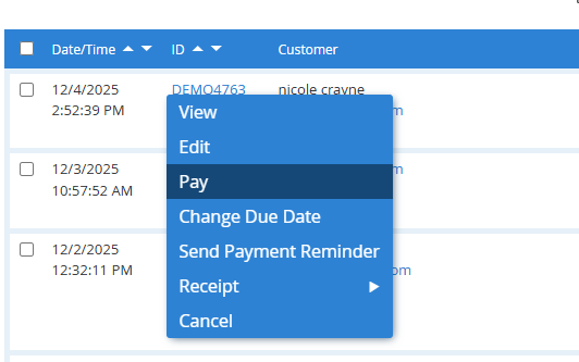 This will bring up a payment screen similar to the Box Office that allows you to edit transaction details and pay full or partial amounts on the invoice.