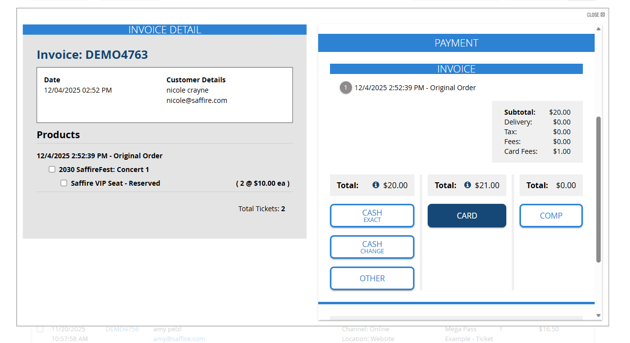 Payment can be made by cash, check, card, comp, or any other payment types (located under Other) that you have set up.